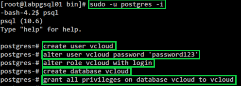 Then we create the vcloud user and database by issuing the following commands (one after the other). Please replace password123 with the password that you would like to use.