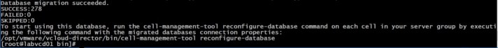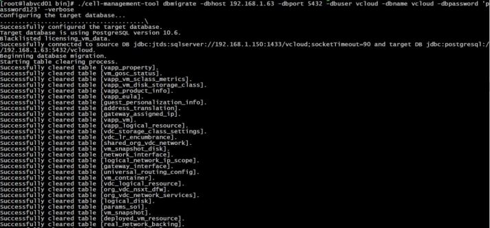 ./cell-management-tool dbmigrate -dbhost 192.168.1.63 -dbport 5432 -dbuser vcloud -dbname vcloud -dbpassword ‘password123’ -verbose