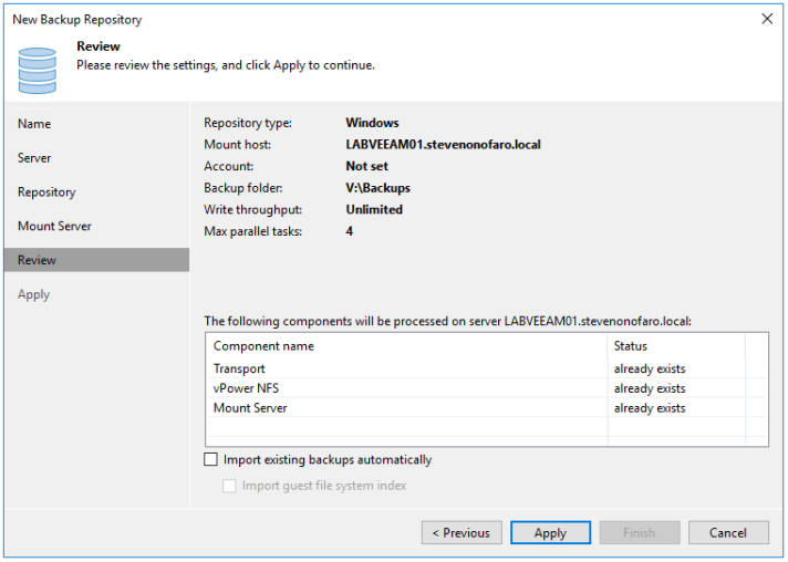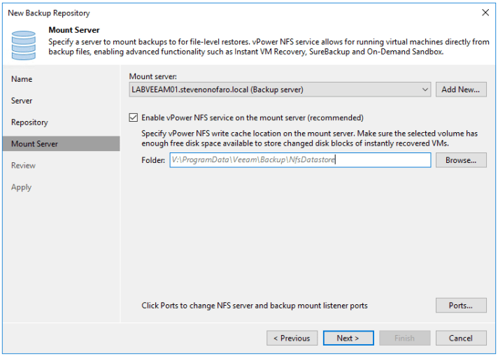 Select the location for your vPower NFS write cache and System Catalog and click Next. For this example I am going to use the default values as I am running this up in my lab. If this is production it would be a good idea to specify a separate location for the vPower NFS write cache