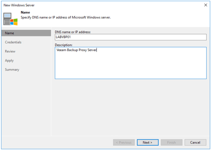 Click the Add New button, then enter the Name of the Win 2016 Server you would like to setup as a Veeam Proxy. Then Click Next