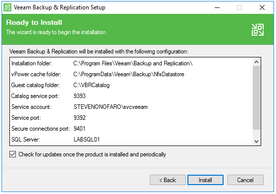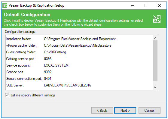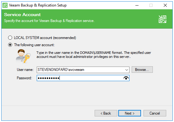 Here we specify the service account we are going to use. Make sure this account is a local administrator on the Veeam Backup Server