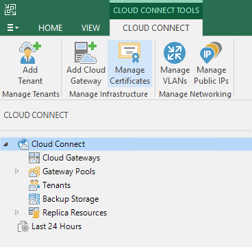 Next its time to install our Public Certificate on the Veeam Backup Server. To do this click on the Cloud Connect Menu. Then highlight Cloud Connect and click on Manage Certificates