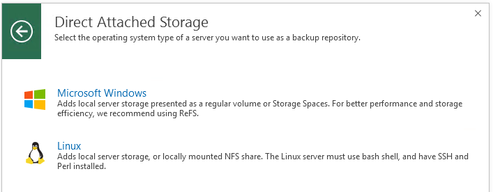 Select the type of Backup Repository you would like to add and follow to prompts to complete. For this deployment I am just going to use some Direct attached storage.