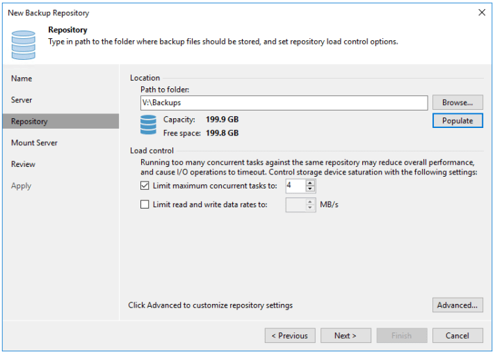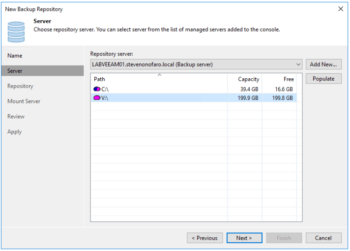 Add in a different server or click Populate if you have mapped the drive to this Veeam Server. Select the drive letter and click Next