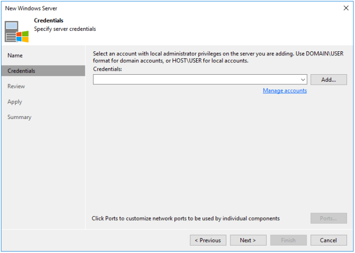 Select the server credentials to use from the drop down menu or add a new account by clicking Add. Then click Next
