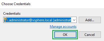 Then select the account required to connect to vCenter, for our example it will be the administrator@vsphere.local account. Then click Ok