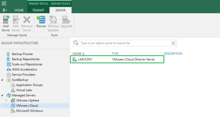 First we need to go to our Veeam Backup & Replication Server and connect to our vCloud Director Instance. You can do this by selecting Backup Infrastructure from the left hand side menu then click on VMware vCloud. Then select Add Server from the top menu