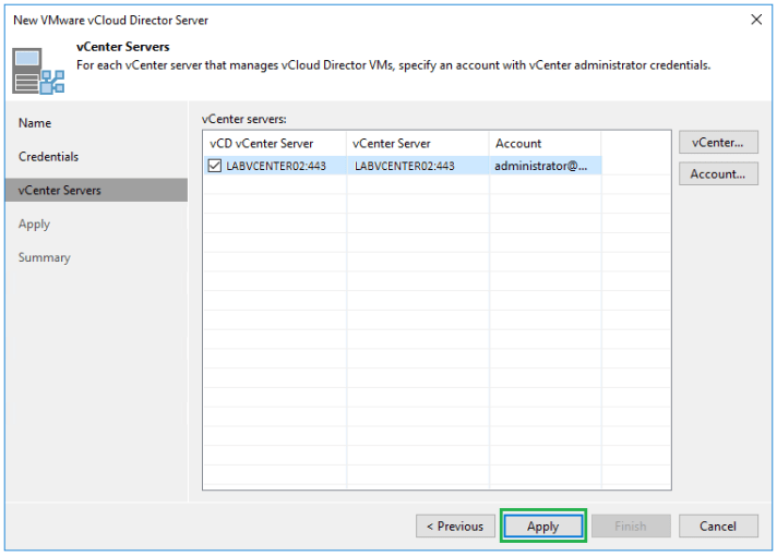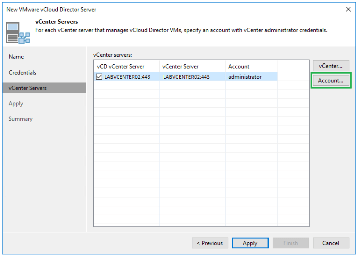 It will then scan vCloud Director for the vCenter Server that is connected and it will be added to the list below. Select the vCenter Server and click Account
