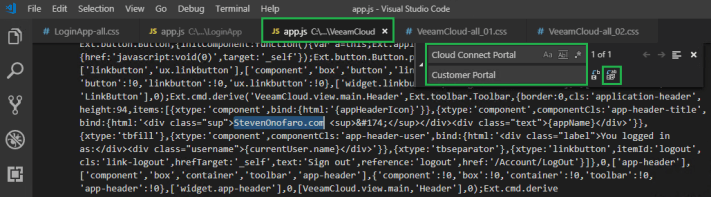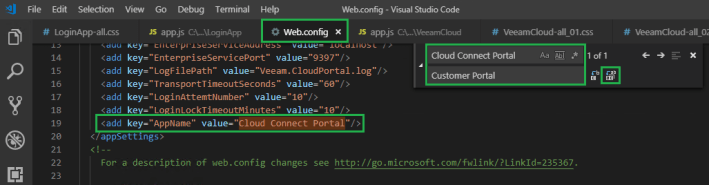 In the Visual Studio Code Menu click on Edit then Replace, in the Find box type Cloud Connect Portal and in the Replace box enter the text you would like it to display