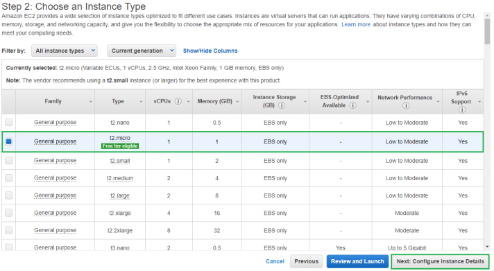Now it’s time to select the Instance Type. For this trial run I am just going to use the t2.micro version which is part of the free tier. Select the Instance Type that suits your use case and click Next: Configure Instance Details