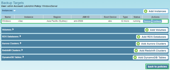 Once your instance has been added click on Back to policies