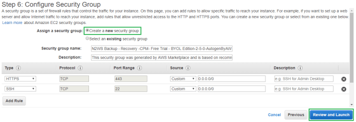 For the Security Group I am going to use the default settings and allow it to create a new security group. You can also lock down access to your instance from your static IP. Then click Review and Launch