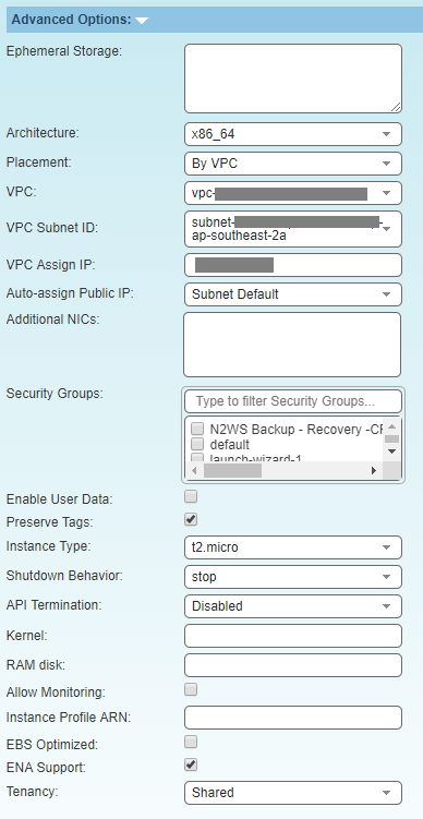 The Instance Recovery page will then launch, from here you can use the default entries to recovery the entire Instance. There is also an Advanced Options section which allows you to change any of the following settings for your recovered Instance
