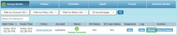 The Windows instance that I took a backup of has now been deleted. Let’s now switch back over to our N2WS console and in the Recovery Panel click on Instance in the Recover column