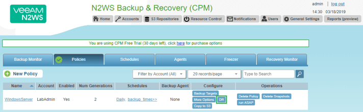 Now let’s create a policy to backup one of the EC2 Instances we have running at the moment. Select the Policies Tab and click on New Policy