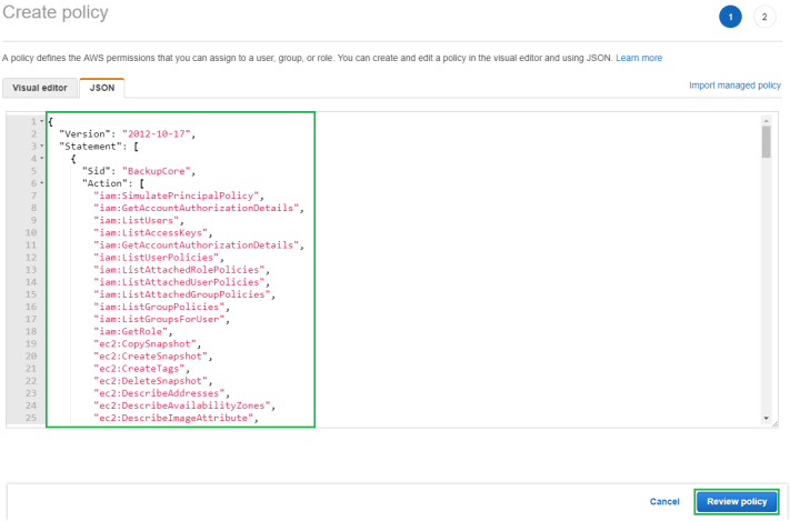 Then in the new window select the JSON tab and highlight and delete the entries located in there by default. Then paste in the JSON policy settings which are available for download from the N2WS support site.
