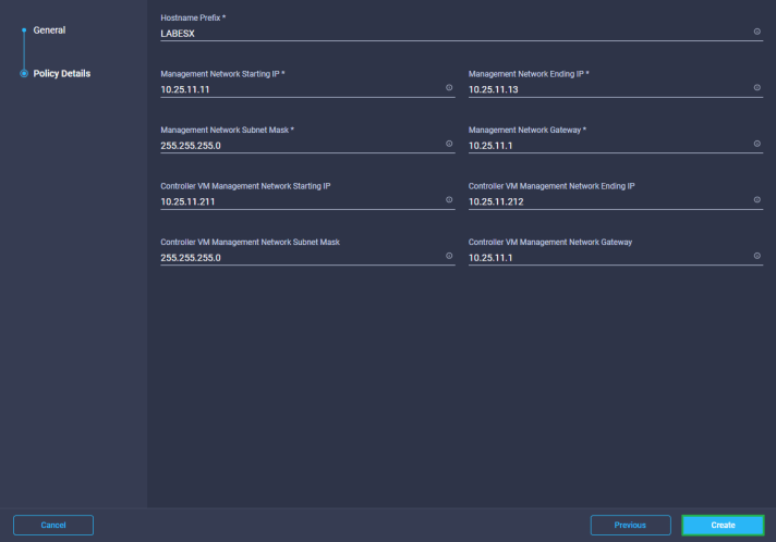 Next we need to enter the Hostname Prefix and all of the Management IP’s that will be used to configured the 2 node HyperFlex Edge Cluster. Once complete click Create