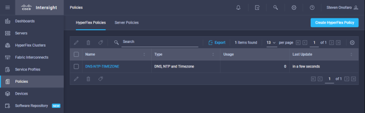 Then select Policies from the left hand menu and then click Create HyperFlex Policy. We are going to create a New Hyperflex Policy that we will use to apply to the 2 Node Edge Cluster