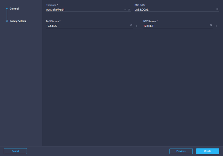 Select your Timezone from the drop down menu, then set your DNS Suffix. Then enter your preferred DNS and NTP Servers. Once complete click Create