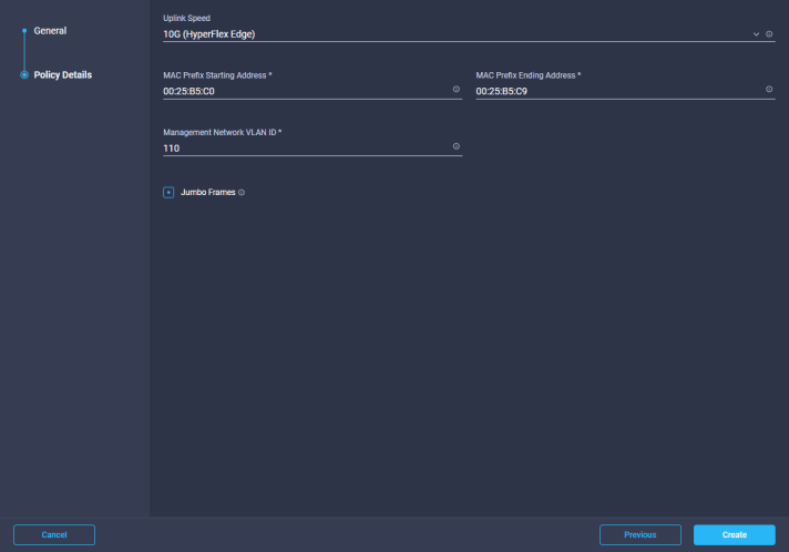 Then enter the MAC Prefix you would like to use and enter your Management Network VLAN. Also Jumbo frames is always enabled when you select 10G for a 2 Node Edge setup. Once complete click Create