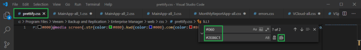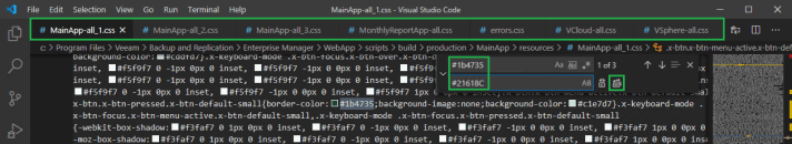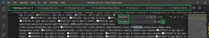 Now this colour code was fun to locate! In the Find box change the colour code to #245c45 and then change the Replace code to #2874A6 (use a light colour here again), then click the Replace All icon to the right. This code only needs to be changed on the MainApp-all_2.css, MonthlyReportApp-all.css, Vcloud-all.css and vSphere-all.css.