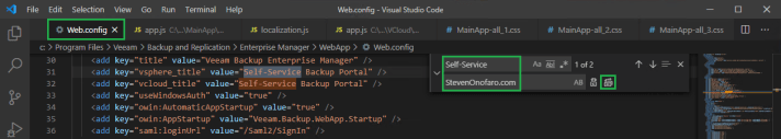 In the Find box enter Veeam Backup Enterprise Manager and in the Replace box enter the text you would like to display then click the Replace All button.