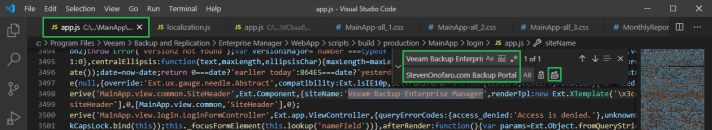 To change the heading Veeam Backup Enterprise Manager which is displayed in the top left corner open the following app.js file.