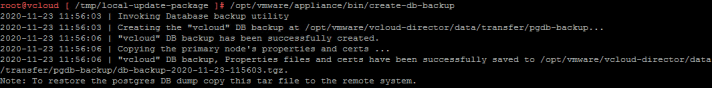 Next up we need to back up the database, if you only have the one cell then this is easy. If you have more than one, then as I mentioned earlier you can identify which is the primary by connecting to the cell ip on port 5480. To back up the database we need to be connected to the primary cell before running the following command,