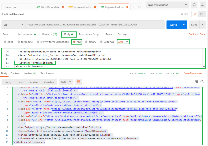 Now we need to perform a GET request using the following URL – https://vcloud.stevenonofaro.net/api/site/associations/6d2f1162-b138-4aef-ac42-320f32b5d45c