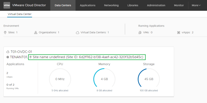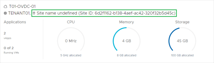 After deploying new or upgrading your Cloud Director environment to 10.2 you may notice the tenants site name displaying something similar to “Site name undefined (Site ID: 6d2f1162-b138-4aef-ac42-320f32b5d45c)”