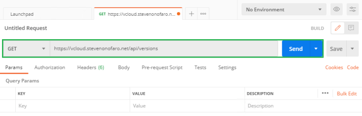 To get started enter your Cloud Director URL and append it with /api/versions and click Send