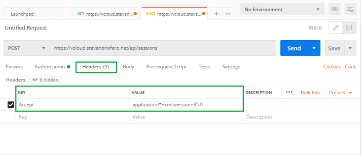 Then click on the Headers tab, set the Key to Accept and the Value to application/*+xml;version=35.0