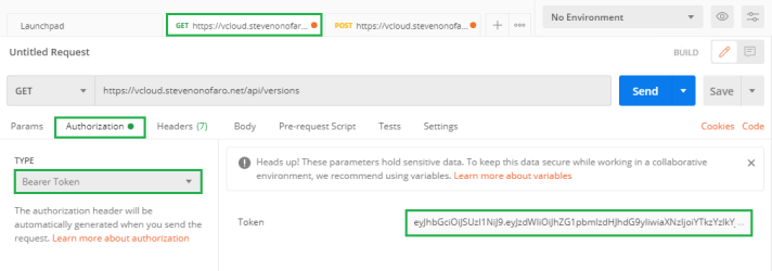 Now switch back to the first GET tab we created initially. Click on the Authorization tab and change the type to Bearer Token. Then paste in the token we just copied from the previous POST tab.