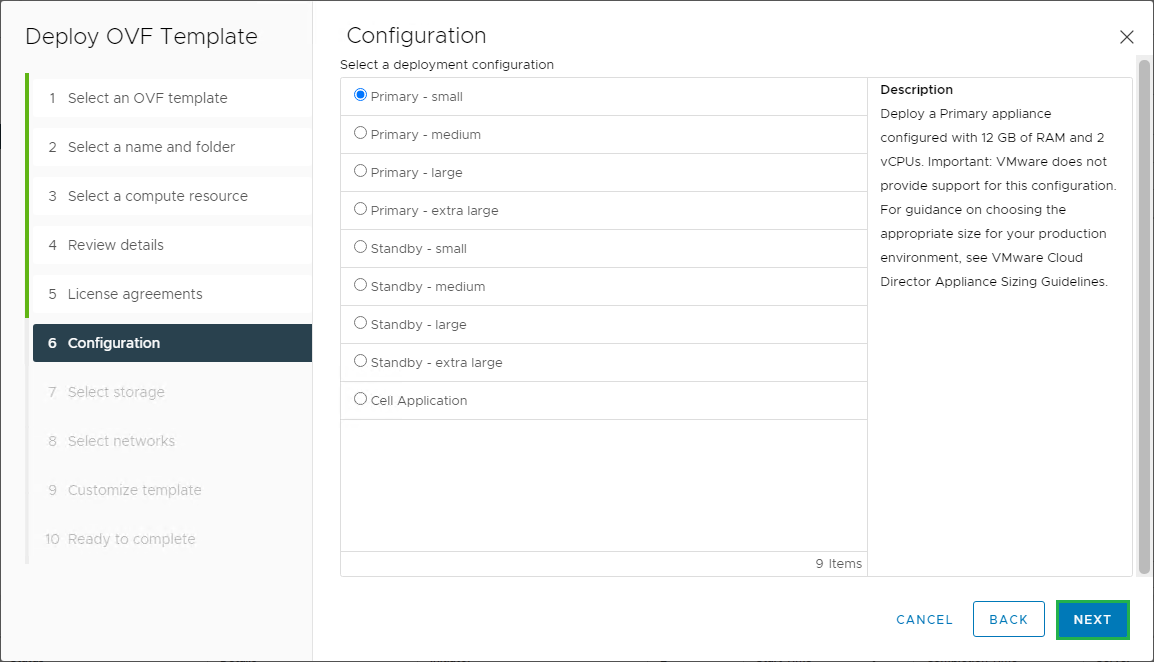 Choose your deployment configuration and click NEXT. For this example I am going to use Primary – small.