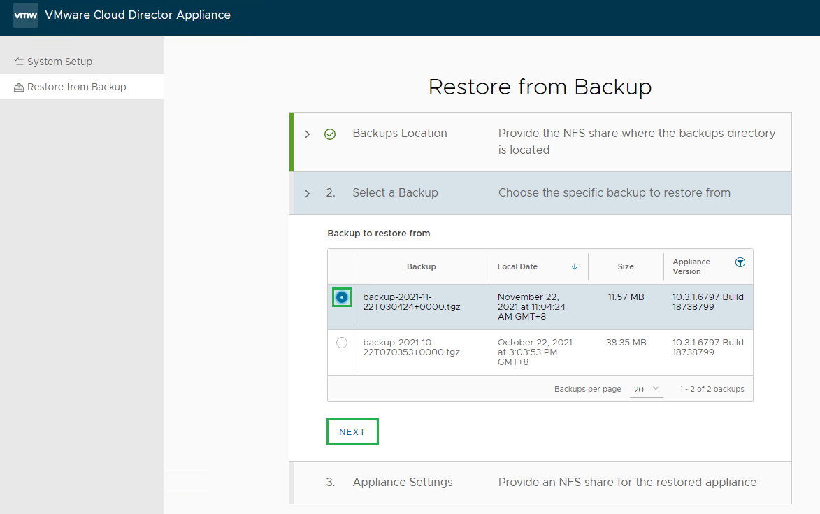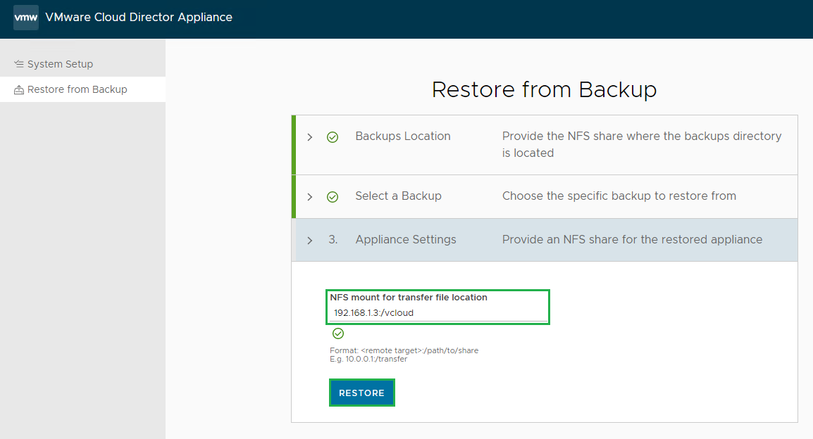 Select Restore from Backup on the left hand menu and enter the NFS mount address we checked earlier. Then click NEXT