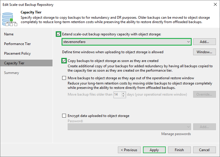 In this example I have selected Copy backups to object storage as soon as they are created. Once the normal backup job is complete the offload job to copy the data to the capacity tier will start.