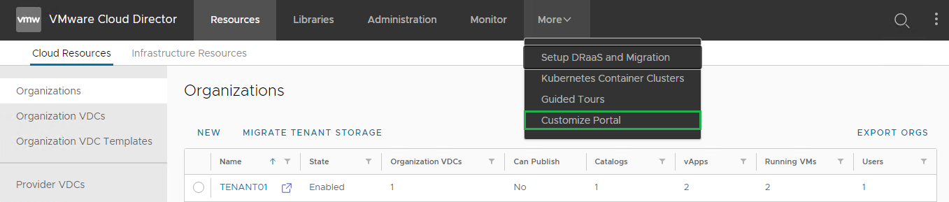 Then login to the vCloud Director provider portal, select the More drop-down menu and click on Customize Portal.