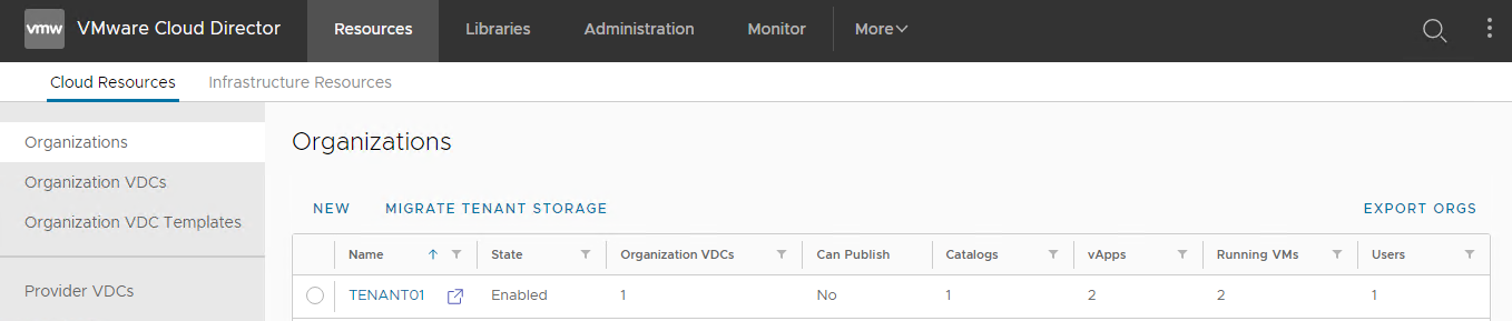 The next thing you will need is a Tenant Organization setup in your vCloud Director instance with a couple of VMs running. For this example we will use TENANT01 that I have setup below.