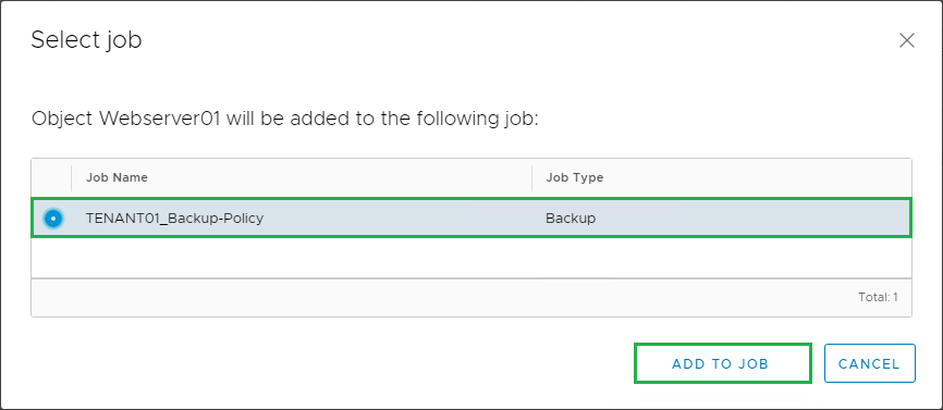 After selecting Add to Backup you will then be prompted to select the backup job to add the VM too. Click Add to Job. The VM has now been added into the backup job without you even having to switch over to the Self-Service Portal.