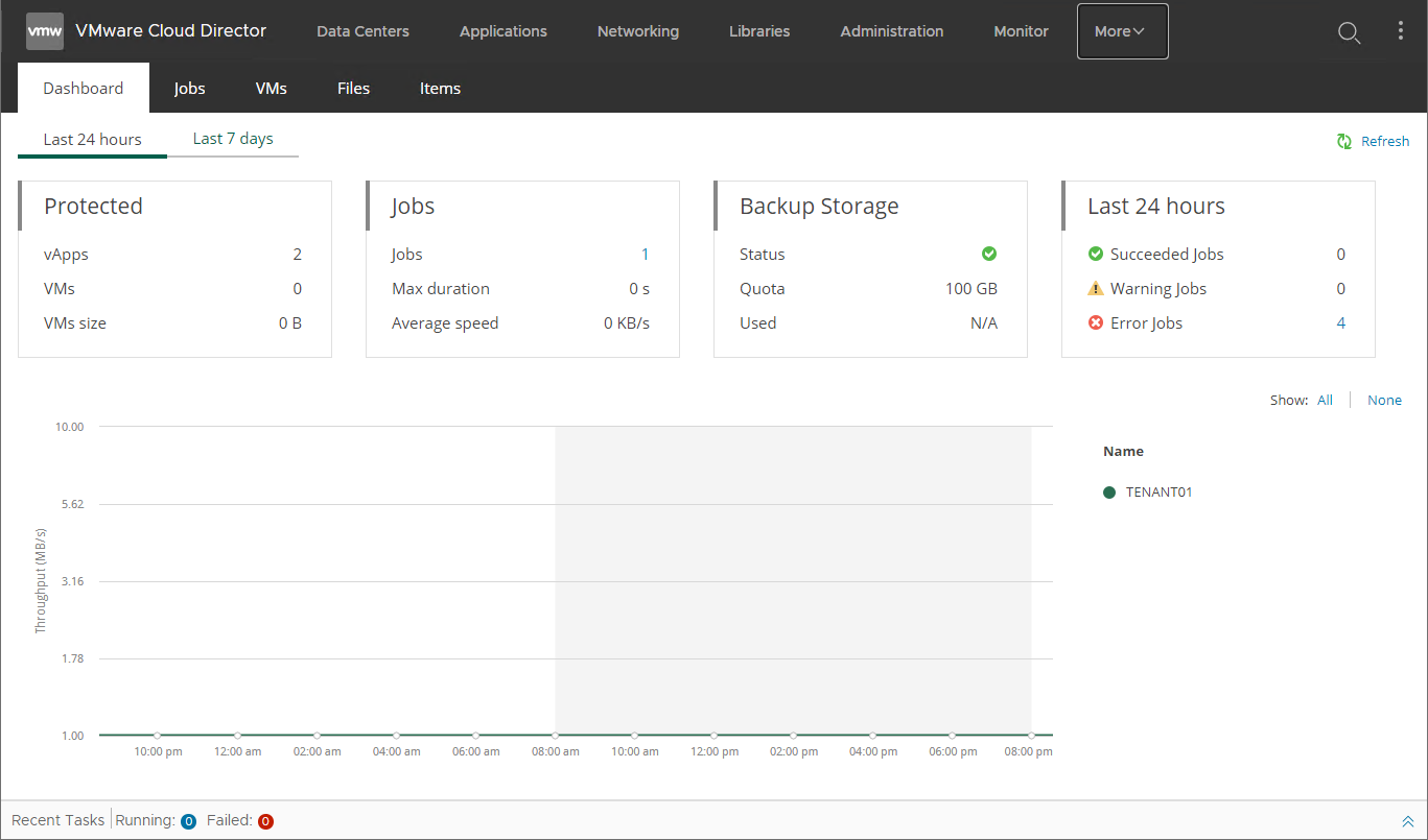 The self-service backup portal is now accessible to the customer using a dedicated URL and their existing vCloud Director login details. Here is an example of the self-service backup portal for TENANT01 – https://backup.stevenonofaro.net:9443/vCloud/TENANT01