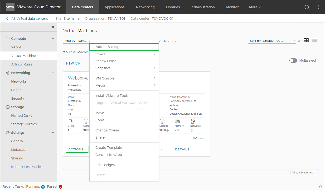 Once you have created a backup job for your tenant there is also one other bonus feature Veeam have added in with v11. If you select the Actions button next to one of your VMs you will also notice Add to Backup has been inserted into the vCloud Director VM menu system.