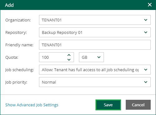 Friendly Name – Set a friendly name for this customer. This friendly name will also be used as the repository name the tenant can see when creating a new job.